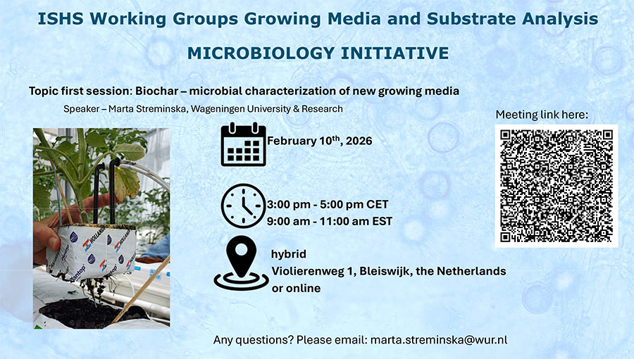 ISHS Working Groups Growing Media and Substrate Analysis invite you to attend the first (hybrid) meeting of the Microbiology Initiative Topic: Biochar – microbial characterization of new growing media Speaker: Marta Streminska, Wageningen University & Research Centre, Business Unit Greenhouse Horticulture Date: February 10th, 2026 Time: 3pm-5pm (Central European Time)/ 9am-11am (Eastern Standard Time) Venue: […]13 January 2026